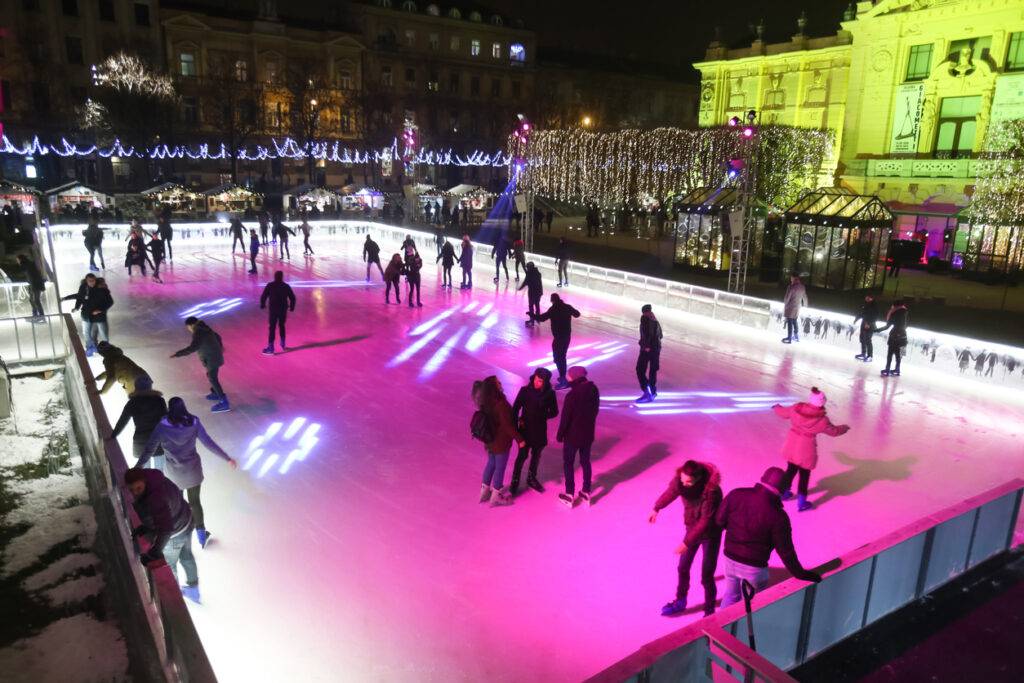 Der König-Tomislav-Platz bietet eine große Eislaufbahn, eingerahmt von historischen Gebäuden. Familien, Paare und Gruppen gleiten hier über das Eis, begleitet von weihnachtlicher Musik.