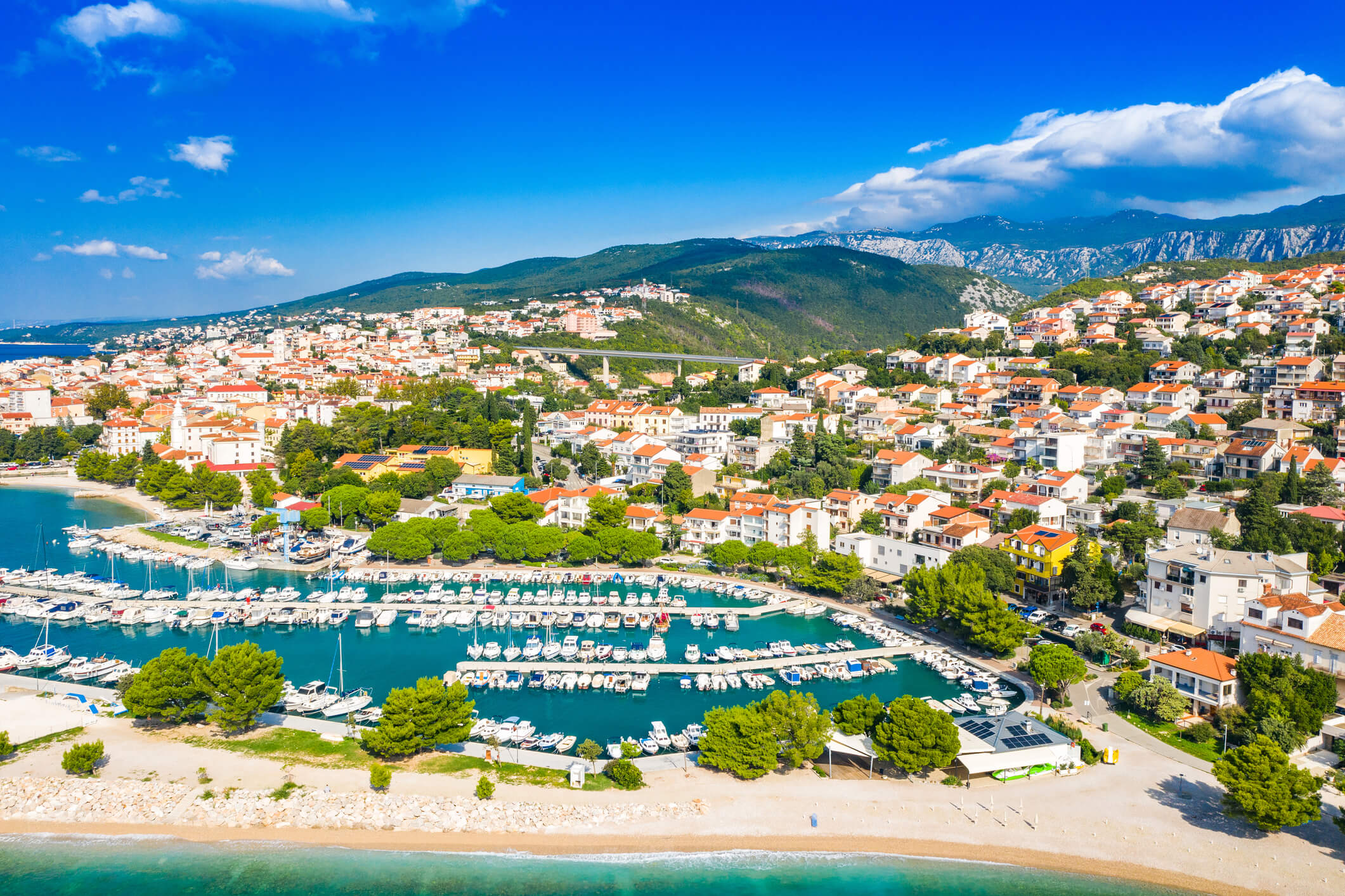 Crikvenica liegt in der Kvarner Bucht, einer der schönsten Landschaften Kroatiens. Zwischen der Halbinsel Istrien im Westen und der Insel Krk im Osten erstreckt sich ein Küstenabschnitt, der von Bergen im Hintergrund geschützt wird. Diese Lage sorgt für ein außergewöhnlich mildes Mikroklima.