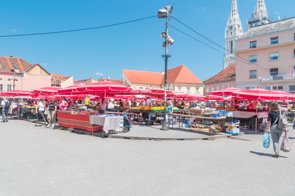 Der Dolac Markt ist der wichtigste Wochenmarkt. Hier verkaufen Händler Obst, Gemüse, Fisch, Käse, Brot und Blumen. Die roten Sonnenschirme des Marktes gehören zum Stadtbild.